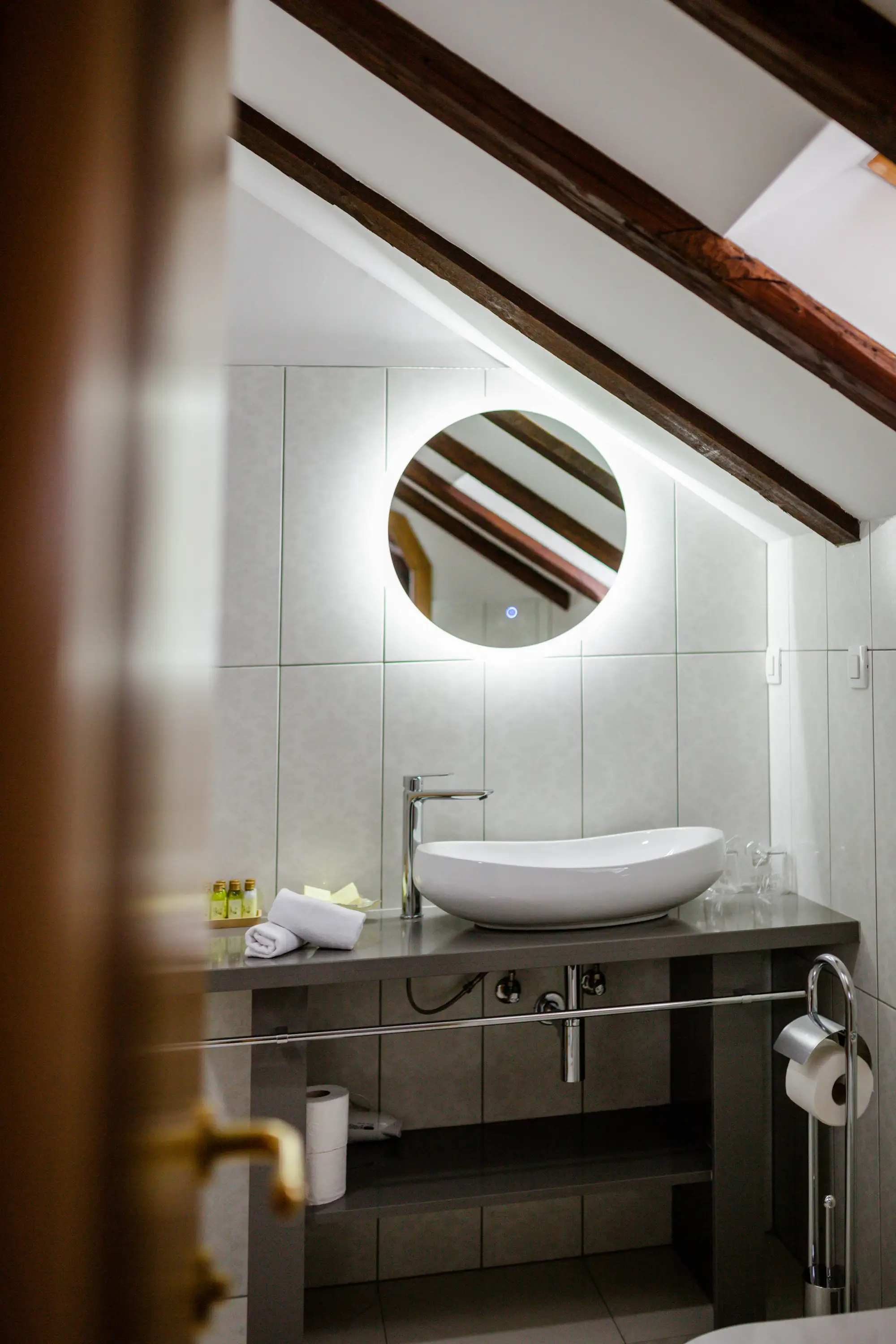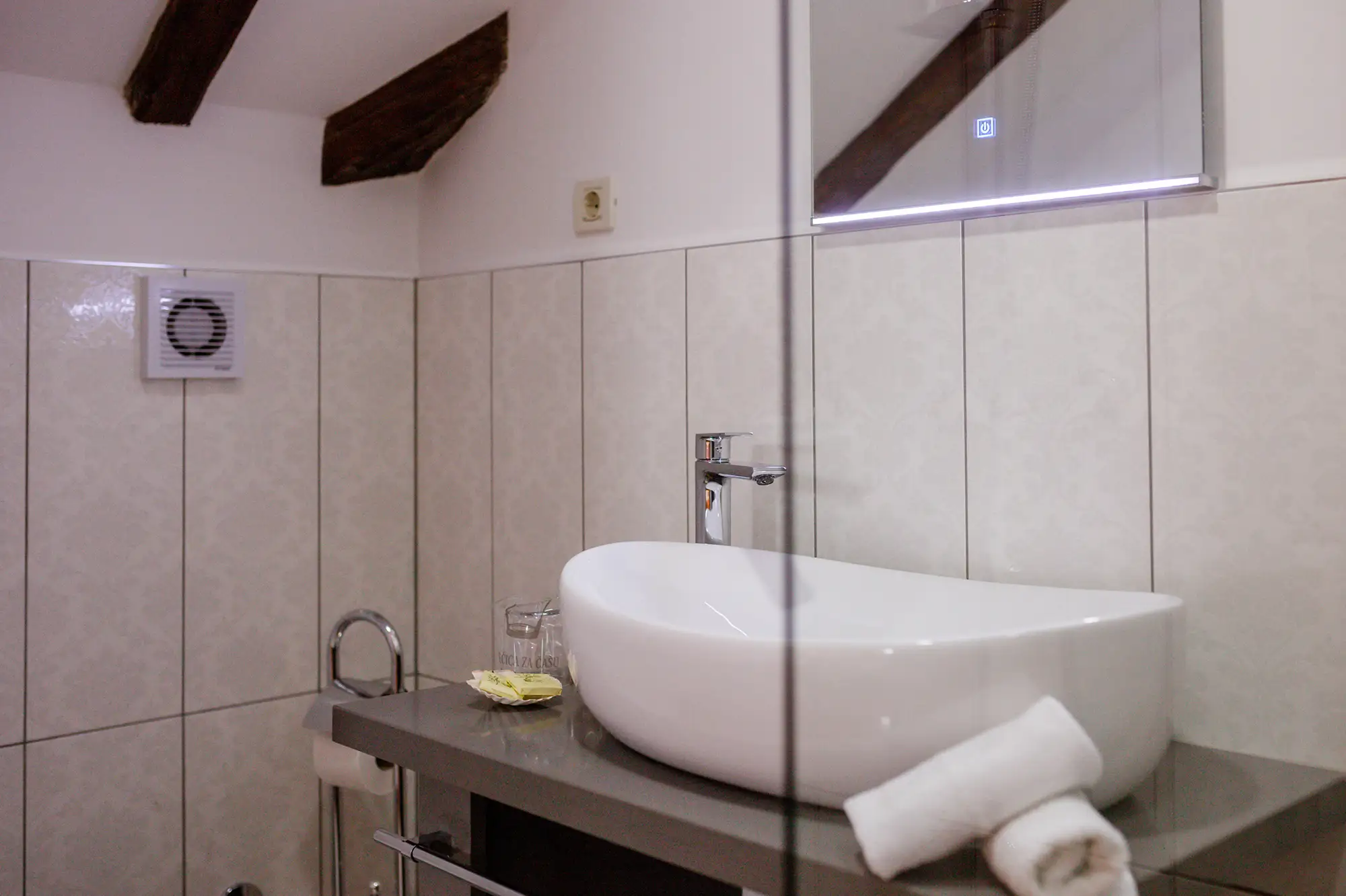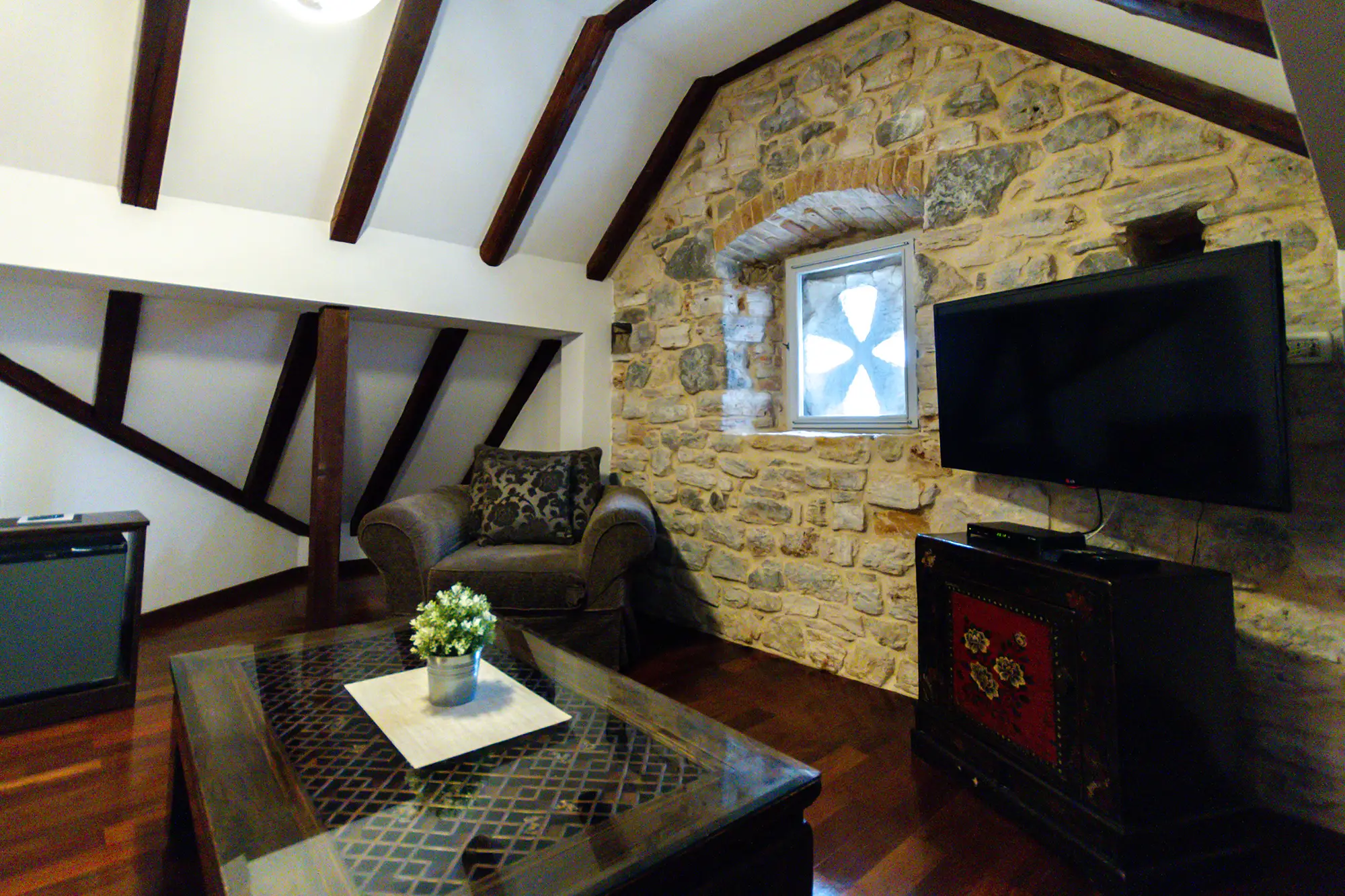 Deluxe obiteljski apartman Apolon veliki je apartman koji se prostire na cijelom potkrovlju vile od 117 m2, što gostima pruža dodatnu privatnost i intimu boravka. Apartman se sastoji od dvije velike spavaće sobe, dnevnog boravka, garderobe i kupaonice. Dizajniran je i namješten u toplim bojama koje doprinose atmosferi svjetlosti i svježine.