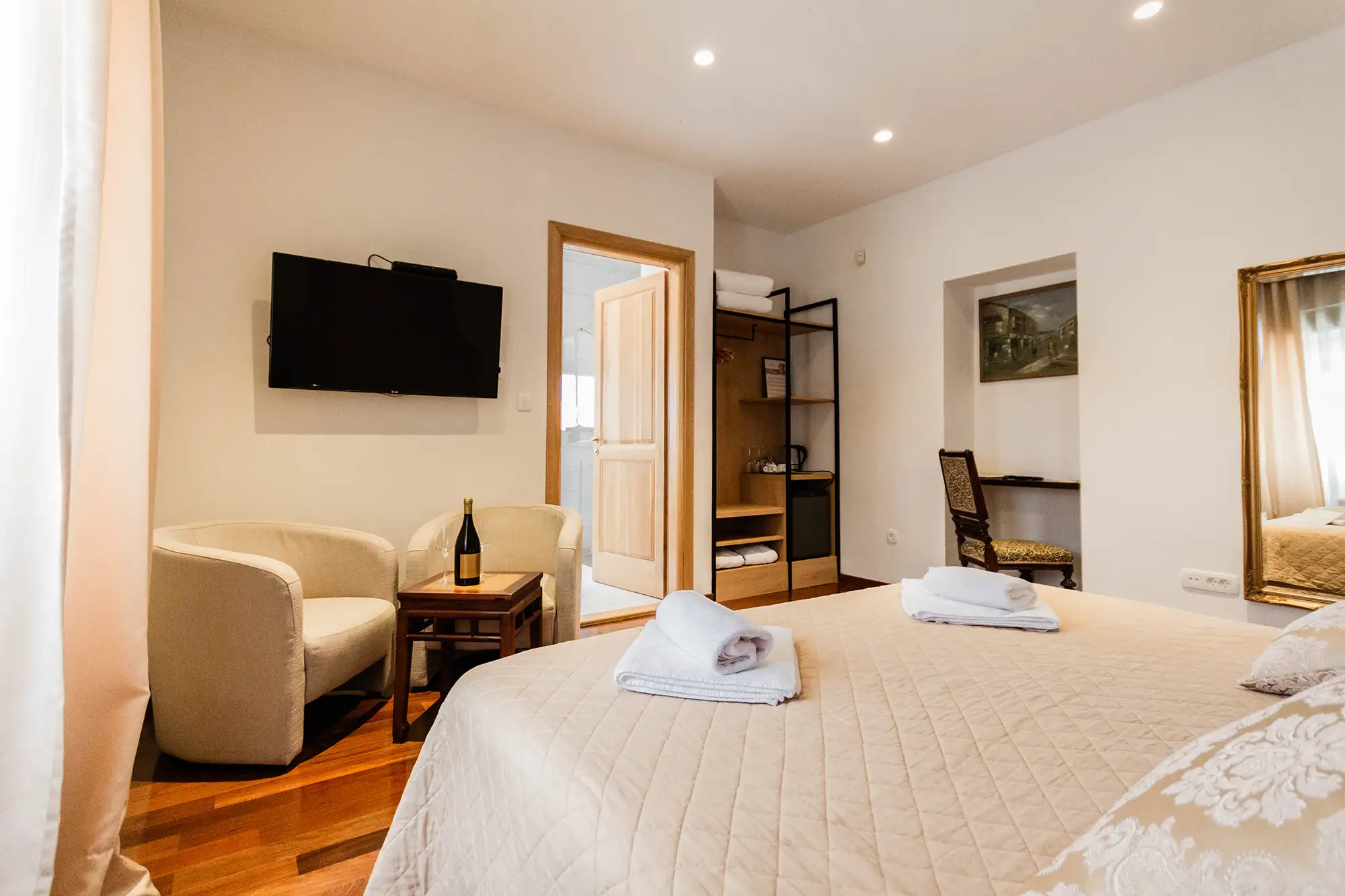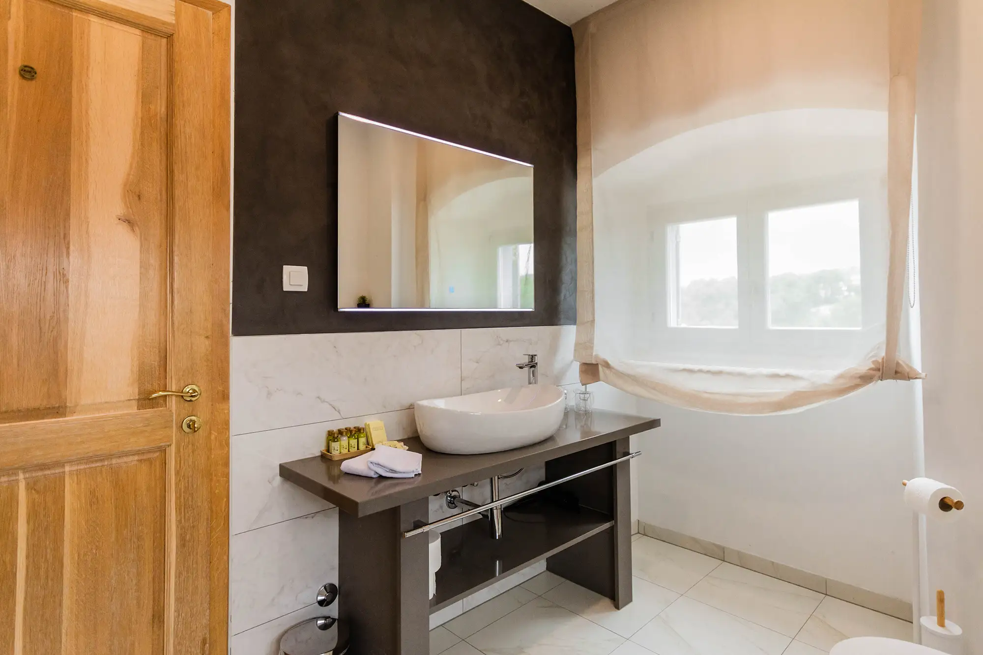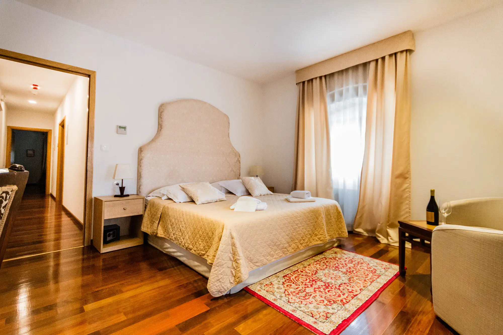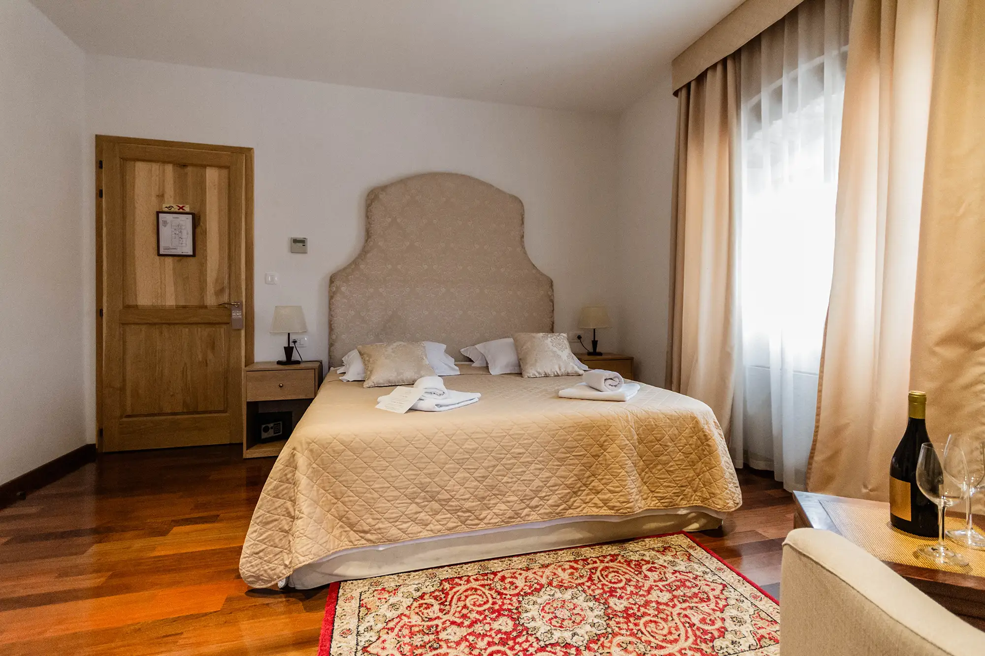 Superior soba Talija površine 36 m2, s pogledom na vrt. Sastoji se od velike spavaće sobe s tapeciranim super king size krevetom, ormara, sjedećeg prostora i kupaonice s tušem. Namještena u toplim nijansama s tamnim detaljima.