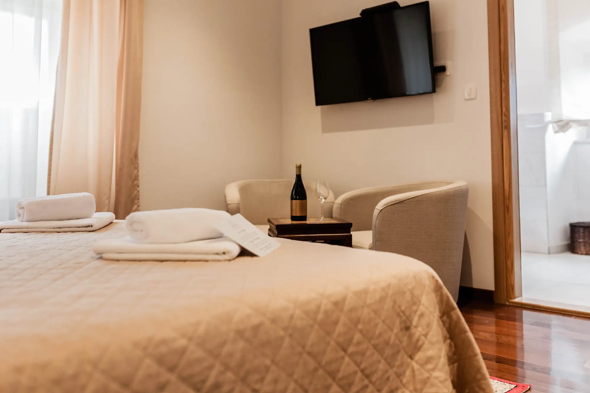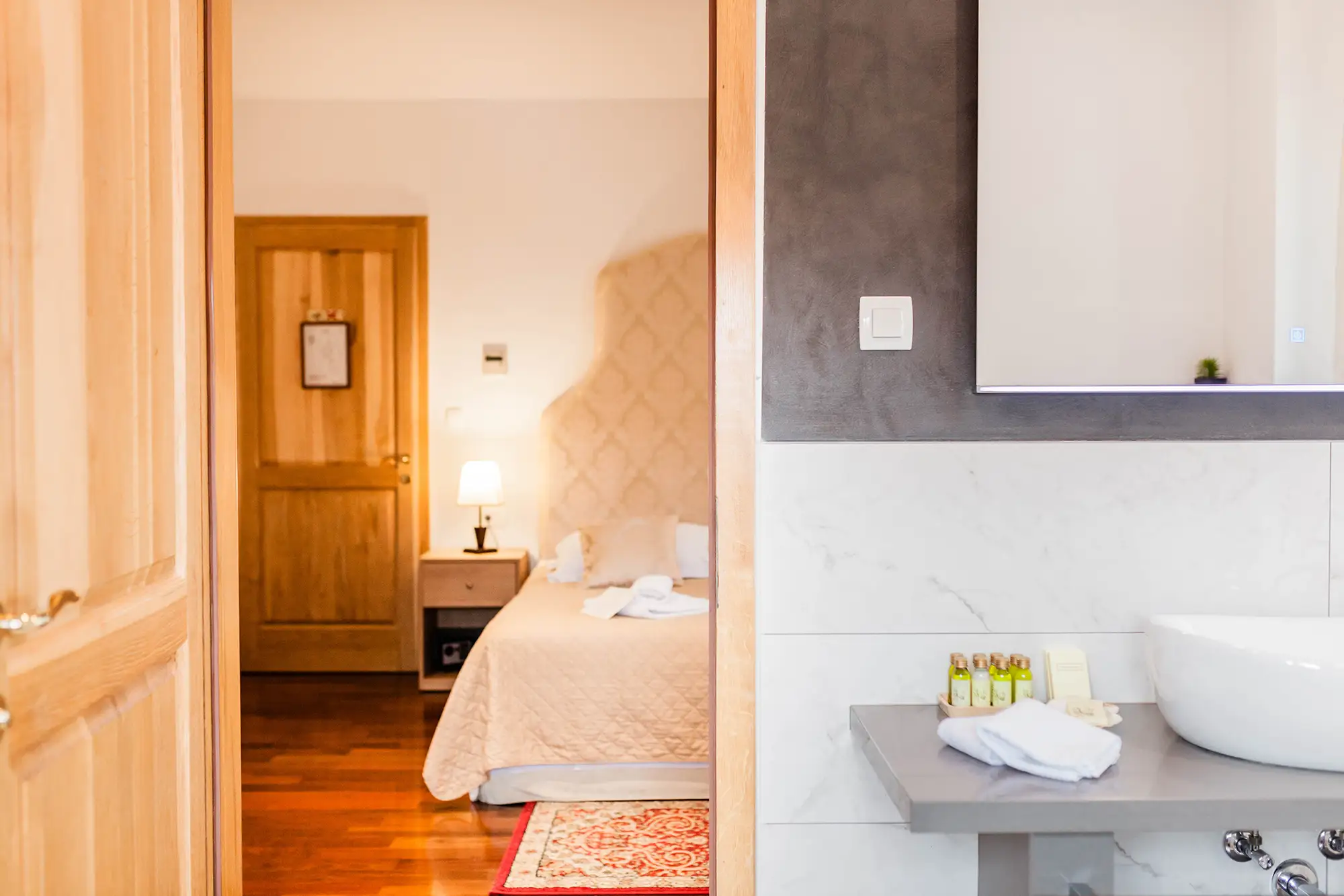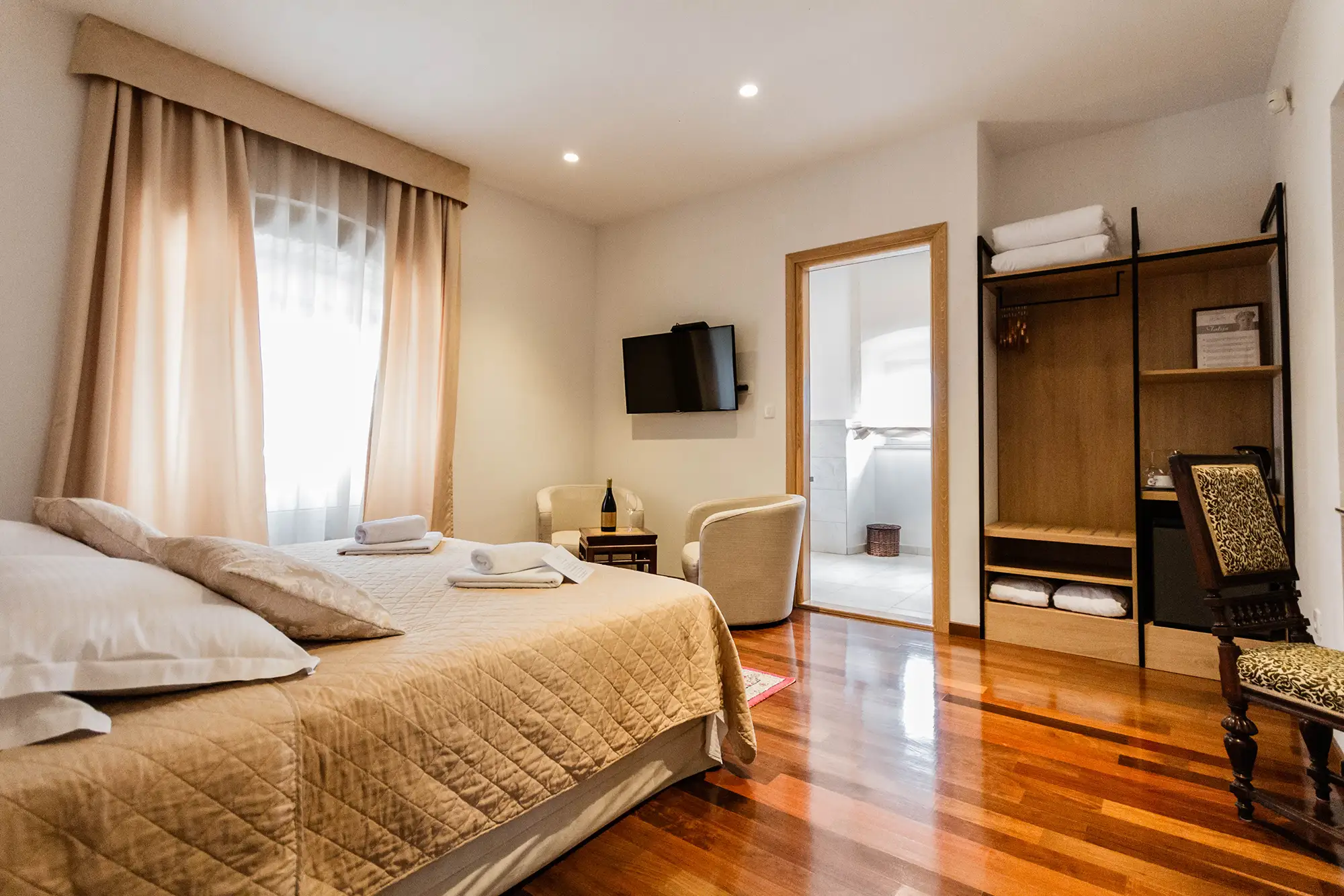 Superior soba Talija površine 36 m2, s pogledom na vrt. Sastoji se od velike spavaće sobe s tapeciranim super king size krevetom, ormara, sjedećeg prostora i kupaonice s tušem. Namještena u toplim nijansama s tamnim detaljima.